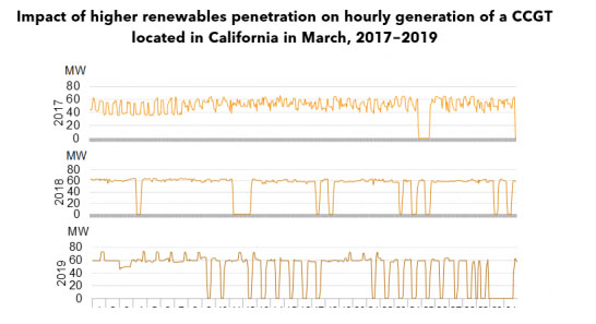 隨著可再生能源滲透率的提高,加利福尼亞州天然氣發(fā)電廠的利用率逐年下降