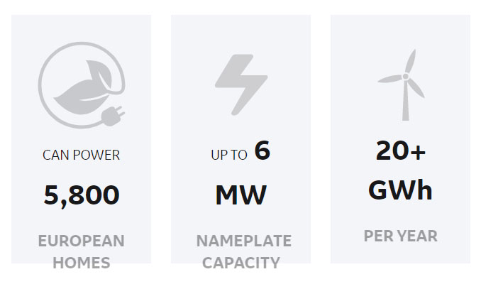 單機(jī)最高6.0MW,單臺(tái)機(jī)組可供5800個(gè)歐洲家庭用電,年發(fā)電20+GWh