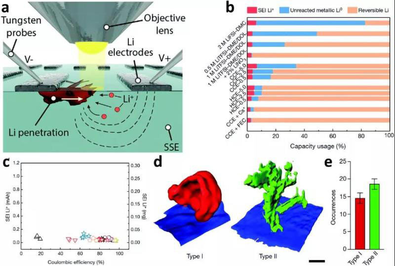 圖18 (a)面內(nèi)電池幾何結構和實驗裝置的示意圖;(b)鋰電池總?cè)萘康姆謹?shù);(c)庫侖效率和電解質(zhì)中形成SEI所消耗的Li+之間缺乏相關性;(d)兩種枝晶結構的三維重建;(e)兩種類型的樹突數(shù)量大致相等。