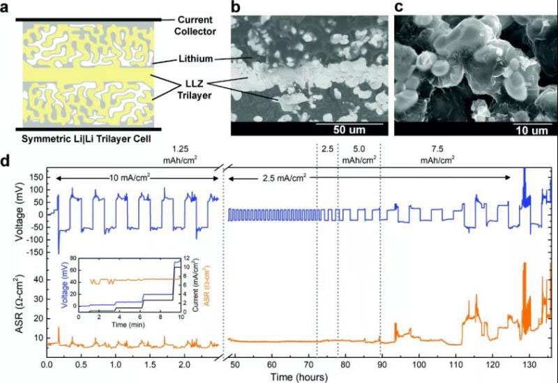 圖17 (a)三層鋰對稱電池示意圖;(b)三層石榴石的背散射電子圖像;(c)SEM圖片;(d)恒電流循環(huán)期間,電池電壓響應(藍色)和特定區(qū)域電阻(橙色)。