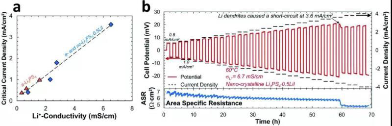 圖16 (a)鋰枝晶生長起始點和鋰離子電導率之間的關系;(b)臨界電流密度測試。