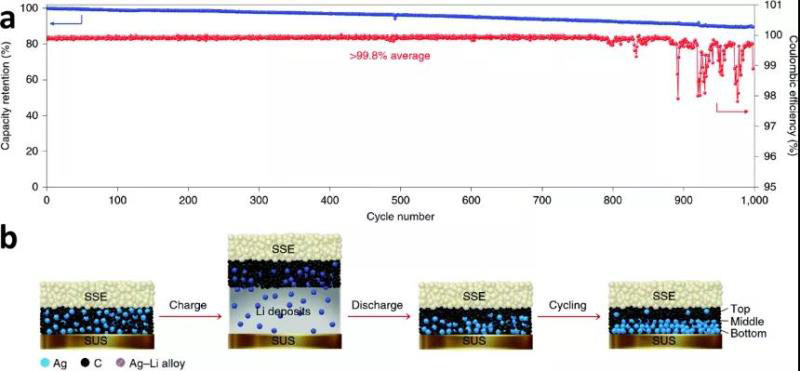 圖15 (a)一個NMC/Li6PS5Cl/Ag–C電池的循環(huán)壽命和庫侖效率;(b)充放電過程中,Ag-C納米復合材料層下,集流體上的鋰電鍍/剝離示意圖。