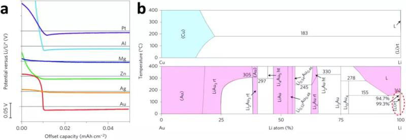 圖14 (a)鋰沉積過程中,不同材料的充電曲線;(b)鋰與銅(上)和金(下)的相圖。