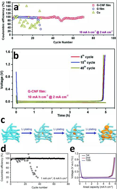 圖13 (a)庫倫效率;(b)充放電曲線;(c)鋰沉積到中空碳纖維中/上的行為示意圖;(d)庫倫效率對比;(e)中空碳纖維中/上的鋰電鍍/剝離的充電/放電曲線。