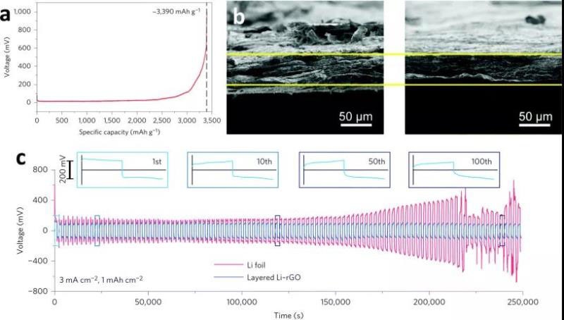圖12 (a)鋰-還原氧化石墨烯電極的電勢曲線;(b)鋰-還原氧化石墨烯電極厚度的原位掃描電鏡表征;(c)循環(huán)性能。