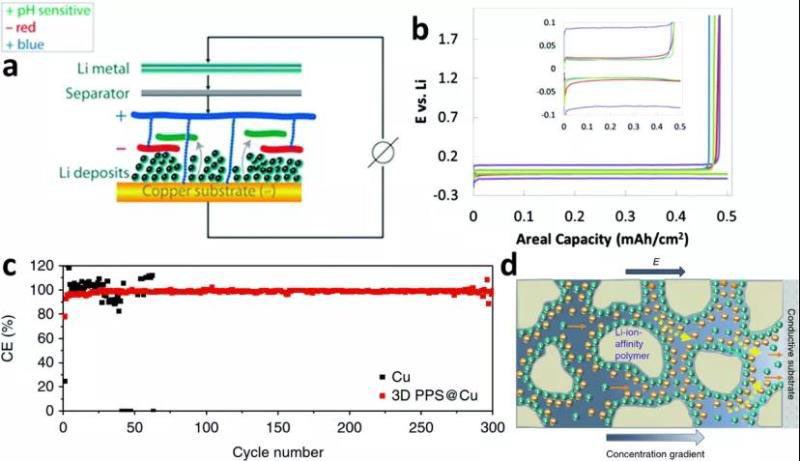圖11 (a)描繪平面銅集流體上帶相反電荷的聚合物的逐層結構的示意圖;(b)鋰沉積/溶解第7圈的電壓曲線;(c)在裸銅箔(黑色)和具有聚乙烯亞胺海綿層的銅箔(紅色)上沉積鋰的庫倫效率;(d)在鋰電鍍過程中靠近集流體的帶負電的聚乙烯亞胺海綿的示意圖。