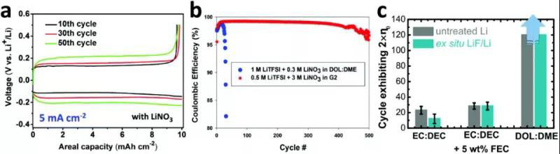 鋰金屬電極的另一個關鍵指標是庫侖效率,它本質(zhì)上是電極循環(huán)穩(wěn)定性的一種度量,可用于預測電池的循環(huán)壽命。即使消除了由于溶解的多硫化鋰導致的正、負電極之間的電子穿梭,也必須提高鋰金屬的循環(huán)壽命,以獲得更接近實際可充電電池的預期的循環(huán)壽命。