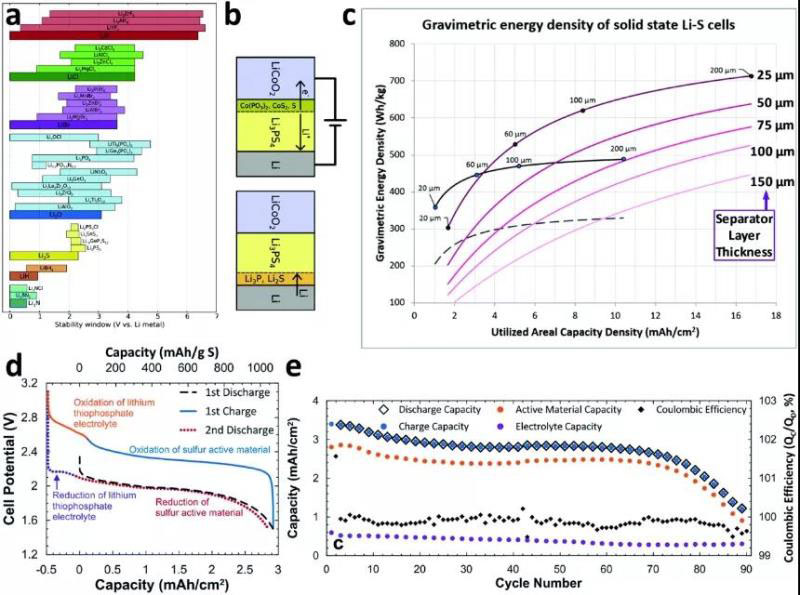 圖8 (a)各種固體電解質(zhì)材料的電化學穩(wěn)定性范圍;(b)Li3P4固體電解質(zhì)和LiCoO2(頂部)或鋰金屬(底部)之間形成的SEIs;(c)固態(tài)鋰硫電池的重量能量密度模型;(d)充放電曲線;(e)全電池容量和庫倫效率。