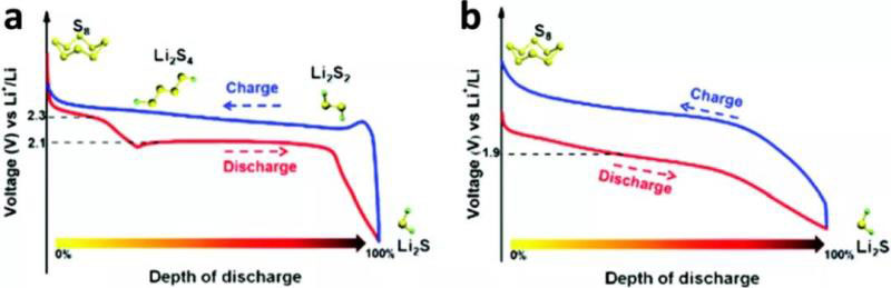 圖2 (a)典型結構和(b)鋰-硫電池的充放電曲線。