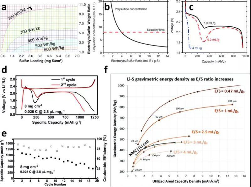 硫電極通常含有大量的碳以賦予導電性,電解質(zhì)賦予離子導電性。不幸的是,這些材料增加了硫電極的重量和體積,而它們本身沒有存儲任何電荷。因此,如果沒有高硫負載和低電解質(zhì)/硫比,高能量鋰硫電池的前景將無法實現(xiàn)。以前,我們將重量能量密度建模為具有75wt%硫正極、75%利用率和2.15V平均放電電位的函數(shù)。圖5a所示的結果表明,電解質(zhì)/硫的重量比<4可實現(xiàn)超過400 Wh kg-1和<3達到500 Wh·kg-1。類似地,硫含量至少在3 mg cm-2以上。不幸的是,在保持高利用率和長循環(huán)壽命的同時,很難實現(xiàn)這兩個特征。