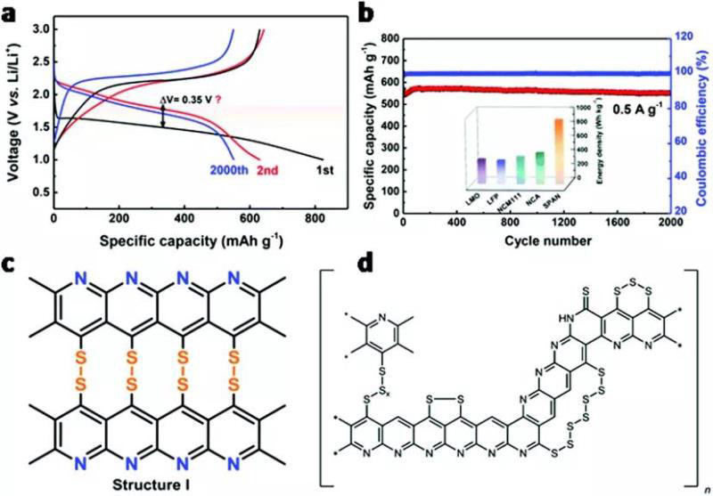 圖4 (a)恒流充放電曲線;(b)循環(huán)性能和庫倫效率;(c)提出了重復的電化學活性單位SPAN。(d)SPAN中提出的結構基元,可能具有電化學活性。