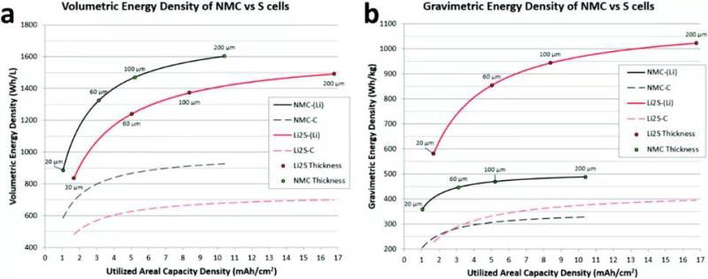圖1 用于比較使用三元材料或硫正極的鋰離子電池的最大能量密度。(a)體積能量密度;(b)質(zhì)量能量密度。