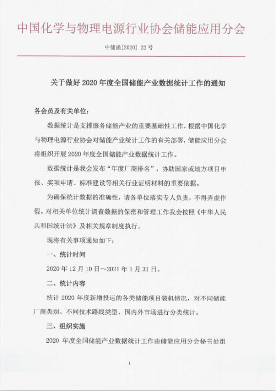 關(guān)于做好2020年度全國(guó)儲(chǔ)能產(chǎn)業(yè)數(shù)據(jù)統(tǒng)計(jì)工作的通知