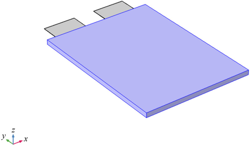 圖3為軟包鋰離子電池的三維結(jié)構(gòu),上述的簡化模型與電芯溫度相關(guān)。由于極耳面積相對較小,為計(jì)算方便,本文在計(jì)算產(chǎn)熱時(shí)考慮極耳發(fā)熱,忽略極耳散熱。