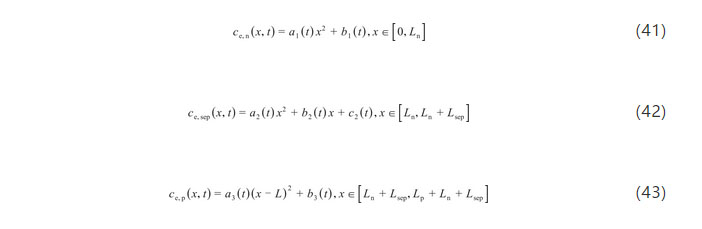 式(32)~(34)中,假設(shè)在t時(shí)刻,沿著x方向,方程左側(cè)的鋰離子濃度變化量為常數(shù),方程右側(cè)鋰離子濃度沿著x方向分布的二階導(dǎo)數(shù)為常值,故此微分方程為拋物線型,根據(jù)邊界條件式(35)、式(36),在正極右端點(diǎn)與負(fù)極左端點(diǎn)處鋰離子濃度變化量為0,即濃度的一階導(dǎo)數(shù)為0,可以將鋰離子濃度ce(x,t)分段為以下連續(xù)的分段函數(shù)