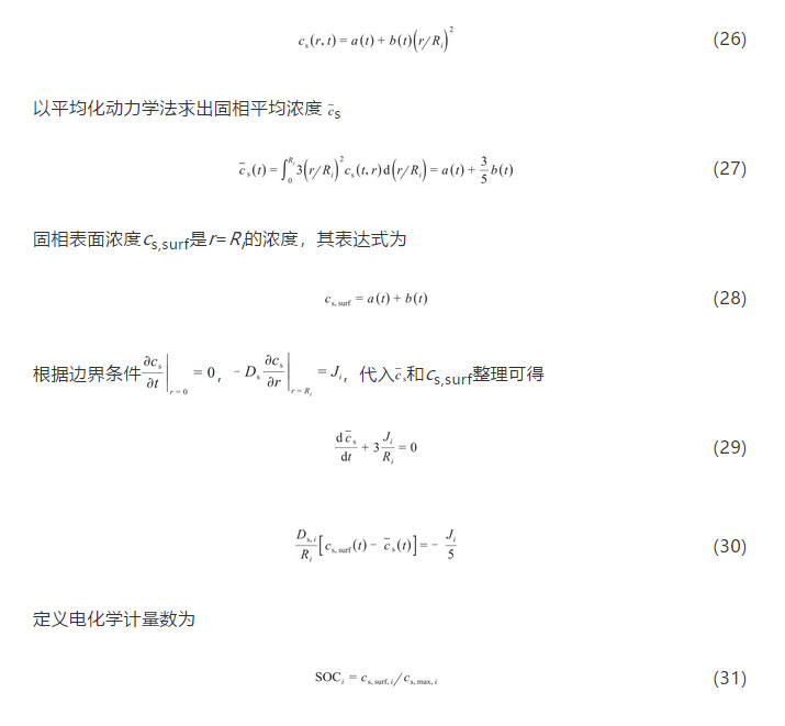 根據(jù)式(1),正負(fù)極顆粒中鋰離子濃度分布沿半徑方向分布為拋物線型,設(shè)固相鋰離子濃度表達(dá)式為二參數(shù)型