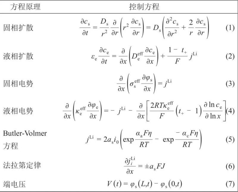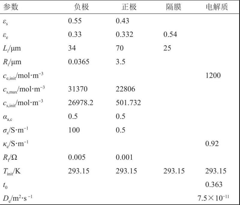 鋰離子的擴(kuò)散、遷移過程可以用偏微分方程描述,按原理可分為7類,具體的控制方程見表1。給定輸入電流,即可得到端電壓、鋰離子濃度等值,由于偽二維模型經(jīng)過充分的測試和研究,在沒有試驗(yàn)測量數(shù)據(jù)的時(shí)候,一般將偽二維模型的仿真結(jié)果作為標(biāo)準(zhǔn)值。本文的靜態(tài)參數(shù)見表2,動(dòng)態(tài)參數(shù)見表3,參數(shù)均來源于文獻(xiàn)[14-16]。