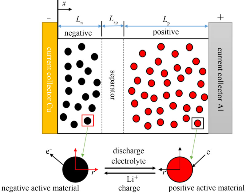 偽二維模型將正負(fù)極的活性物質(zhì)視為均勻球體。如圖1所示,可以將電芯分為5個(gè)部分:正極集流體、正極區(qū)域、隔膜、負(fù)極區(qū)域和負(fù)極集流體。由于沿著x方向與球體半徑r方向有兩個(gè)維度,故稱為偽二維模型。