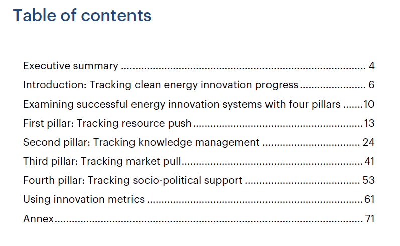 報告中給出的各種指標(biāo),是政府和公司所提議或在實(shí)施的指標(biāo),這些指標(biāo)可從各種來源以及與從業(yè)人員的對話中找到。報告中還提供有一些示例,反映出了現(xiàn)有數(shù)據(jù)中得到的諸多見解。但是,更大的機(jī)會在于將新的追蹤策略和功能納入到清潔能源創(chuàng)新政策中,這也是能源政策制定的核心。