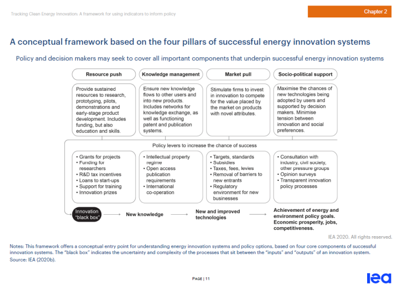 IEA從目前的一些研究和現(xiàn)實(shí)世界的政策示例出發(fā),提出了一個四支柱框架結(jié)構(gòu),以表現(xiàn)一組追蹤進(jìn)度指標(biāo)來反映整個清潔能源創(chuàng)新系統(tǒng)的進(jìn)度。并針對每一個具體的支柱,給出了廣泛的指標(biāo),并采用目前現(xiàn)有的數(shù)據(jù)進(jìn)行重點(diǎn)示例。