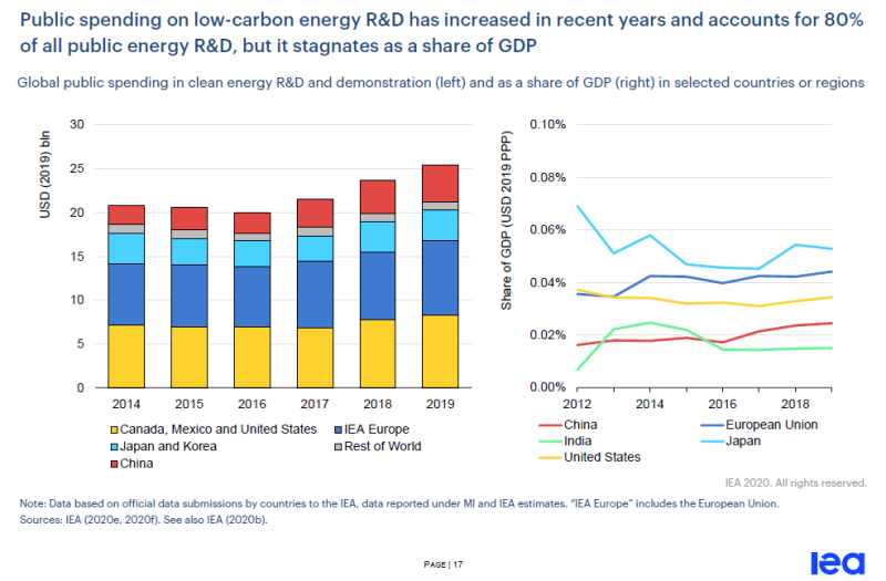 近年來低碳能源研發(fā)方面的公共支出有所增加,占所有公共能源研發(fā)的80%,但在GDP中所占比例卻停滯不前。上圖為幾個選定國家或地區(qū)在清潔能源研發(fā)和示范方面的全球公共支出(左)以及占GDP的比例(右)。