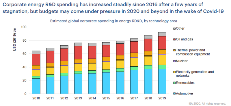 在經(jīng)歷了幾年的停滯之后,企業(yè)能源研發(fā)支出自2016年以來一直保持穩(wěn)定增長,但是在2020年新冠疫情發(fā)生之后,預(yù)算可能會受到壓縮。上圖為按技術(shù)領(lǐng)域分列的全球企業(yè)在能源研發(fā)方面的估計支出。可再生能源的比重還太小。