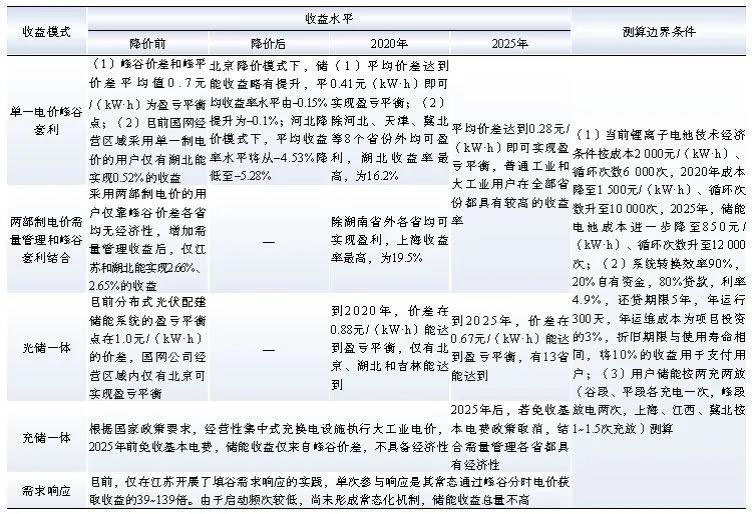 (3)對于客戶側(cè)儲能,需量管理和峰谷價差共同回收模式下,儲能盈利性水平主要與峰谷價差、儲能投資建設(shè)成本、循環(huán)次數(shù)、充放電模式、用戶分成比例以及對需量降低的效率影響等指標(biāo)有關(guān)。通過建立儲能成本分析模式進行經(jīng)濟性測算,當(dāng)前,普通工業(yè)和大工業(yè)用戶安裝儲能僅少部分省份能實現(xiàn)盈虧平衡,隨著儲能技術(shù)經(jīng)濟性提升,按工業(yè)電價降價前目錄電價計算,2020年已具有較好的盈利性。按照2019年工業(yè)電價水平下降要求,在北京市降價模式下(峰、平、谷價格統(tǒng)一下降同一額度,峰谷價差和峰平價差保持不變),儲能收益略有提升,在多數(shù)省份采用的河北省降價模式下(下降比例基本相同,峰谷價差和峰平價差縮小),儲能收益將明顯下降。
