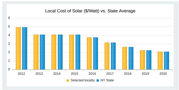 根據(jù)統(tǒng)計(jì),截至10月31日,紐約州累計(jì)完成107,019個(gè)住宅太陽能項(xiàng)目部署,而目前正在部署5,519個(gè)項(xiàng)目。成本下降也為住宅太陽能發(fā)電設(shè)施得到更廣泛的部署,住宅太陽能發(fā)電系統(tǒng)的部署成本從2012年的4.95美元/W下降到2020年2.07美元/W。