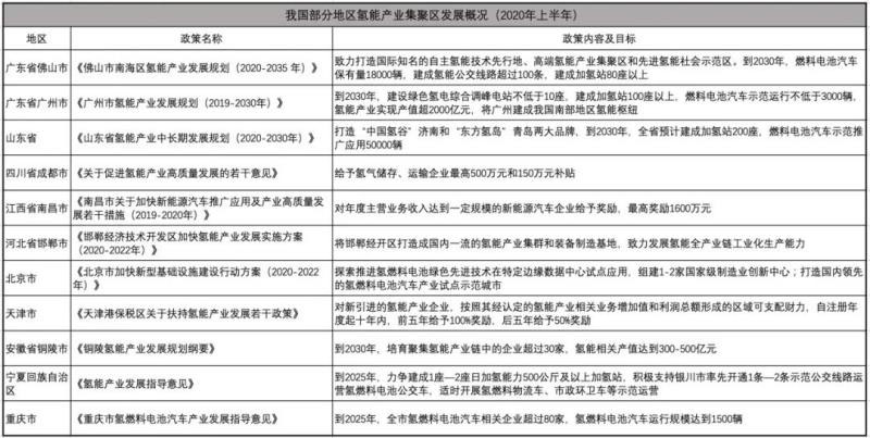 氫能布局,經(jīng)濟(jì)發(fā)達(dá)地區(qū)先行探路,目前國內(nèi)已形成京津冀、長三角、珠三角三大氫能產(chǎn)業(yè)區(qū)域。據(jù)eo不完全統(tǒng)計(jì),自2020年1月到7月,中央政府出臺了7項(xiàng)氫能產(chǎn)業(yè)發(fā)展相關(guān)政策,地方上26個(gè)省市共計(jì)出臺37條氫能產(chǎn)業(yè)發(fā)展相關(guān)政策。從發(fā)布政策的地區(qū)來看,山東發(fā)布6條,數(shù)量最多,廣東地區(qū)5條緊隨其后。河北、安徽、四川、寧夏等地也積極響應(yīng),氫能產(chǎn)業(yè)發(fā)展正在從沿海進(jìn)一步向內(nèi)陸擴(kuò)展。