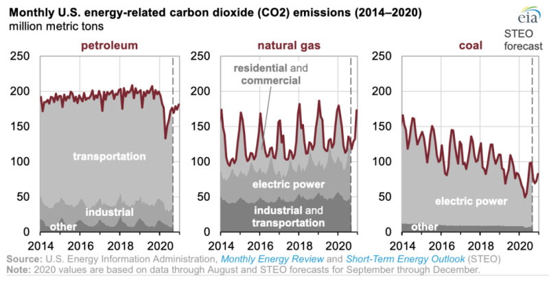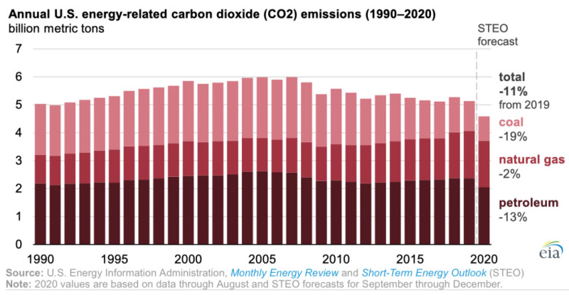 根據(jù)美國(guó)能源信息署(EIA)截至8月的數(shù)據(jù)和EIA對(duì)9月至12月的估計(jì),2020年美國(guó)能源部門的二氧化碳(CO2)排放量可能比2019年低11%。