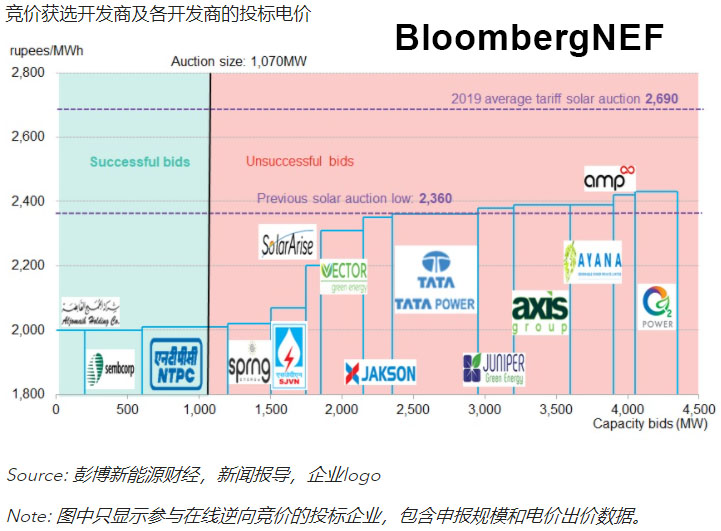 印度太陽(yáng)能公司(SECI)的1.07GW招標(biāo)獲得超額認(rèn)購(gòu),共有14家企業(yè)參與在線逆向競(jìng)價(jià),3家企業(yè)中標(biāo)。本次光伏競(jìng)價(jià)中標(biāo)電價(jià)創(chuàng)下新低,沙特阿拉伯Aljomaih能源和水務(wù)公司(200MW)和印度Sembcorp工業(yè)公司(400MW)報(bào)價(jià)僅2000盧比(26.99美元)/MWh。7家獨(dú)立發(fā)電商的出價(jià)均低于此前2020年6月競(jìng)價(jià)的歷史最低價(jià)2360盧比(31.85美元)/MWh。