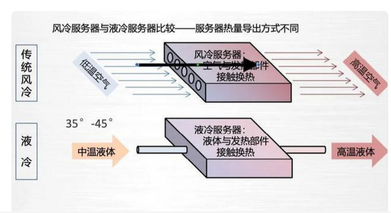 在數(shù)據(jù)中心中,傳統(tǒng)風(fēng)冷一般是通過低溫空氣進(jìn)入到服務(wù)器中,與發(fā)熱部件接觸換熱,再排出高溫空氣;而液冷則是通過中溫液體與發(fā)熱部件接觸化熱,排出高溫液體?!吨袊?guó)液冷數(shù)據(jù)中心發(fā)展白皮書》介紹,液冷技術(shù)不受海拔、地域的影響,可以保持較高的散熱效果、降低能耗,還能提升數(shù)據(jù)中心運(yùn)算效率、空間利用率和能源利用率等。