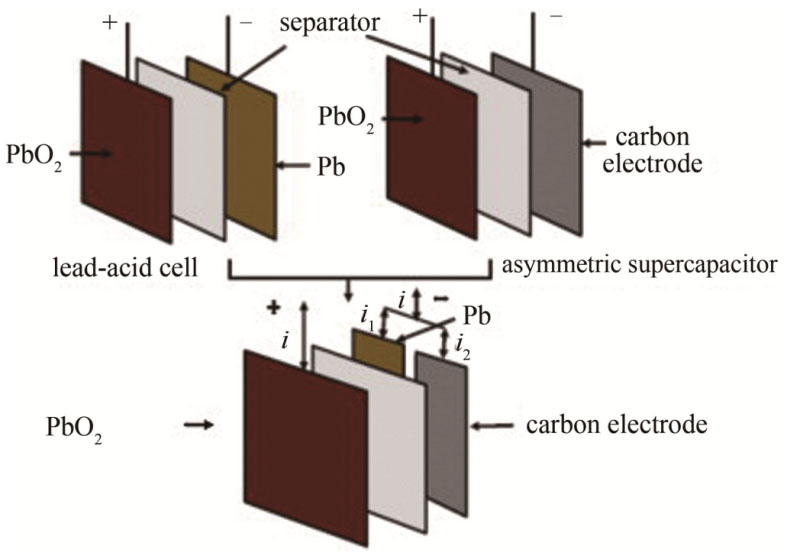 鉛蓄電池主要包括鉛酸電池和鉛炭電池。鉛酸電池是一種以鉛化合物和金屬鉛分別作為正極和負(fù)極材料,硫酸溶液作為電解液的蓄電池。鉛酸電池原料豐富、制造工藝成熟、價(jià)格低廉、性能安全可靠,已應(yīng)用在通信、交通、電力等多個(gè)領(lǐng)域。然而,在大型儲(chǔ)能和電動(dòng)汽車應(yīng)用中,鉛酸電池在高倍率部分荷電狀態(tài)(HRPSOC)下的循環(huán)使用會(huì)造成負(fù)極不可逆硫酸鹽化,大大縮短了鉛酸電池的使用壽命。鉛炭電池是將超級電容器的活性炭電極材料應(yīng)用到傳統(tǒng)鉛酸電池上而形成的一種新型電池,如圖8所示的混合型超級電池,負(fù)極是由兩塊平行的鉛和炭電極構(gòu)成,相比傳統(tǒng)鉛酸電池,壽命可提升一個(gè)數(shù)量級甚至更多。