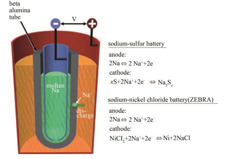 鈉基電池,屬于熔鹽電池,是一類使用熔融鹽作為電極和/或電解質(zhì)的電化學(xué)儲(chǔ)能裝置,目前主要包括鈉硫(Na-S)電池和鈉金屬鹵化物(ZEBRA)電池。這兩類電池的陽極均為熔融鹽鈉,而陰極分別為熔融硫和固體金屬鹵化物,固體電解質(zhì)為β-氧化鋁。圖7為鈉基電池的工作原理示意圖。為了保持熔鹽處于熔融狀態(tài),促進(jìn)反應(yīng)動(dòng)力學(xué),熔鹽電池的工作溫度相對較高(>300 ℃)。
