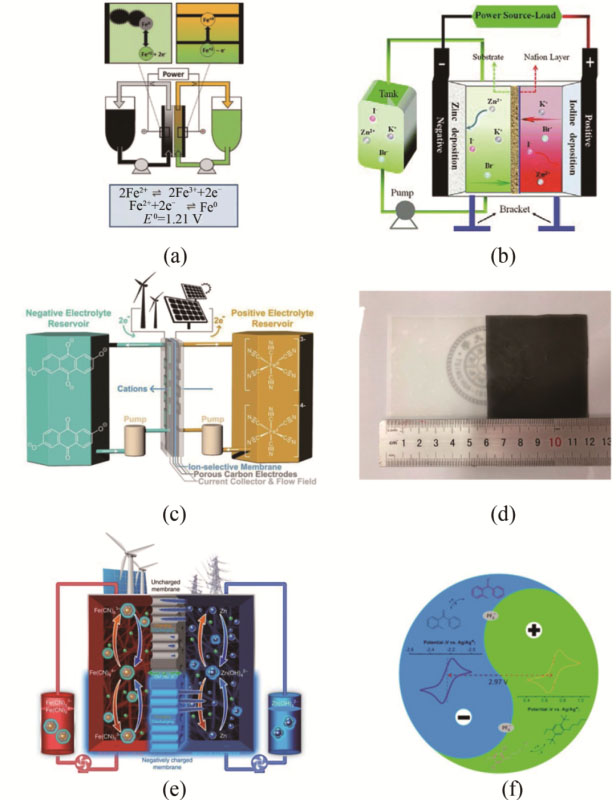 圖6 (a)全鐵液流電池;(b)鋅碘液流電池;(c)堿性有機(jī)液流電池;(d)聚偏二氟乙烯/石墨烯復(fù)合納米多孔膜;(e)鋅鐵液流電池;(f)全液體有機(jī)液流電池