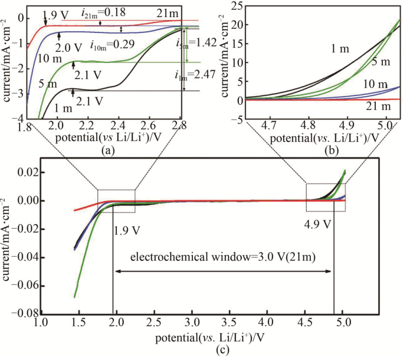 圖5 LiTFSI-H2O電解質(zhì)在非活性電極上的電化學(xué)窗口