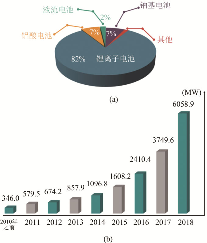 圖2 (a)全球各類電池儲(chǔ)能技術(shù)累計(jì)裝機(jī)容量占比和(b)近年來電化學(xué)儲(chǔ)能累計(jì)裝機(jī)容量