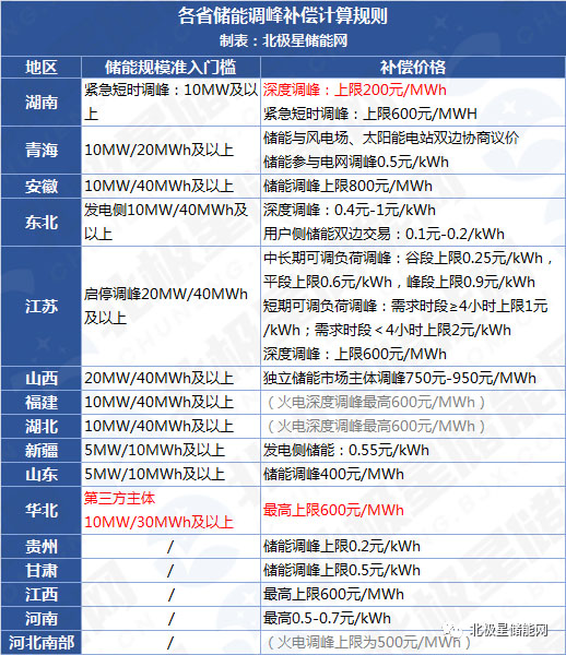 近期湖南、青海、華北對儲能參與調峰輔助服務市場規(guī)則做了調整。青海、湖南儲能調峰申報價格下降,華北上調第三方獨立主體參與調峰申報價格的同時、提高了儲能電站儲能功率和儲能容量規(guī)模。