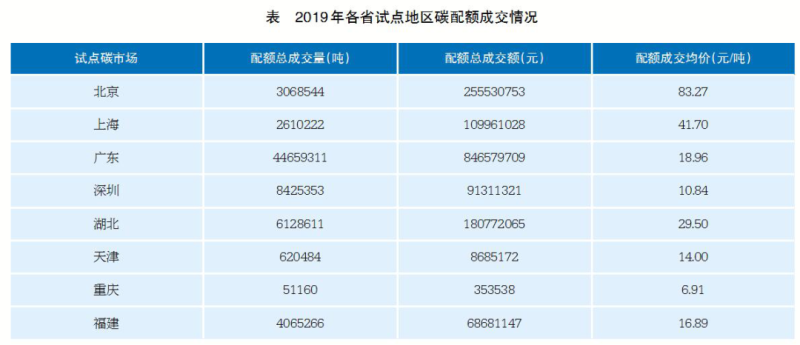 到2019年,我國(guó)試點(diǎn)碳市場(chǎng)建設(shè)不斷深化。各試點(diǎn)不斷探索優(yōu)化配額分配方法,擴(kuò)大覆蓋范圍,改進(jìn)碳排放監(jiān)測(cè)、核算、報(bào)告和核查技術(shù)規(guī)范及數(shù)據(jù)質(zhì)量管理,加強(qiáng)履約管理,確保試點(diǎn)碳市場(chǎng)減排成效。2019年全年,中國(guó)碳交易試點(diǎn)地區(qū)的碳排放配額成交量累計(jì)約6.96千萬(wàn)噸二氧化碳當(dāng)量,累計(jì)成交額約15.62億元人民幣(見(jiàn)表)。