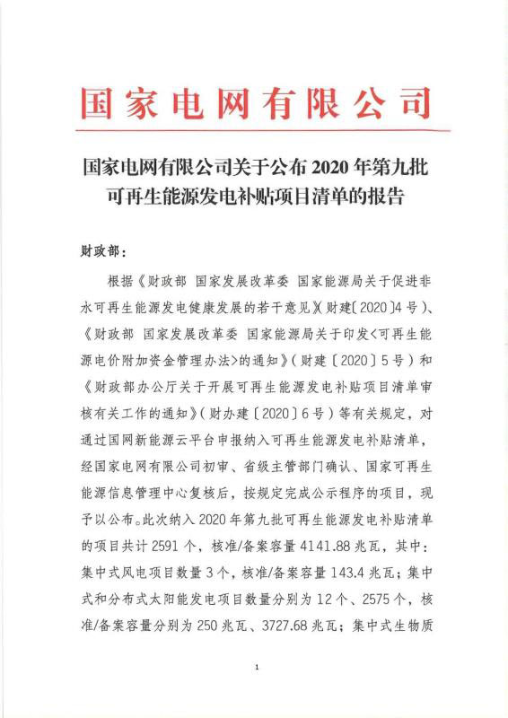 中國(guó)儲(chǔ)能網(wǎng)訊:12月15日,國(guó)家電網(wǎng)公布“2020年第九批可再生能源發(fā)電補(bǔ)貼項(xiàng)目清單”。其中: