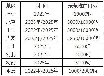 我國(guó)部分省市區(qū)氫燃料電池汽車推廣目標(biāo)