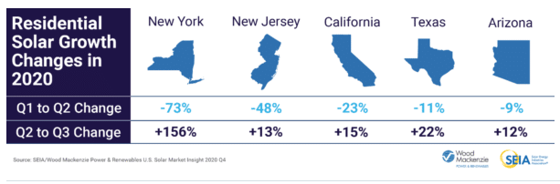 由于大流行抬高了市場(chǎng),今年初幾個(gè)州的太陽(yáng)能安裝量在今年初出現(xiàn)大幅下降之后在第三季度反彈。圖片:SEIA