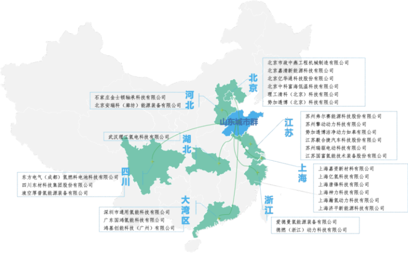 山東省憑借在燃料電池汽車產(chǎn)業(yè)發(fā)展上“起步早”、“基礎(chǔ)厚”“產(chǎn)業(yè)門類全”等優(yōu)勢(shì),率先在燃料電池汽車產(chǎn)業(yè)布局。城市群內(nèi)企業(yè)覆蓋了氫制取、儲(chǔ)運(yùn)、灌充、加注上游供應(yīng)環(huán)節(jié)及燃料電池核心材料及零部件、電堆、系統(tǒng)、整車整機(jī)及終端應(yīng)用全領(lǐng)域,并且聚集了關(guān)鍵產(chǎn)業(yè)鏈環(huán)節(jié)骨干企業(yè),其中制氫企業(yè)40余家、膜電極企業(yè)5家、雙極板企業(yè)7家、質(zhì)子交換膜企業(yè)1家、催化劑企業(yè)3家、碳紙企業(yè)1家、空氣壓縮機(jī)企業(yè)3家、氫氣循環(huán)系統(tǒng)企業(yè)3家、電堆企業(yè)7家、燃料電池系統(tǒng)企業(yè)5家、其他關(guān)鍵部件和設(shè)備企業(yè)16家,主要商用車整車企業(yè)4家、專用改裝車企業(yè)160余家。