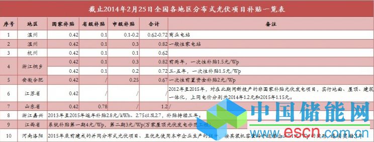 截止2014年2月25日全國各地區(qū)分布式光伏項(xiàng)目補(bǔ)貼一覽表
