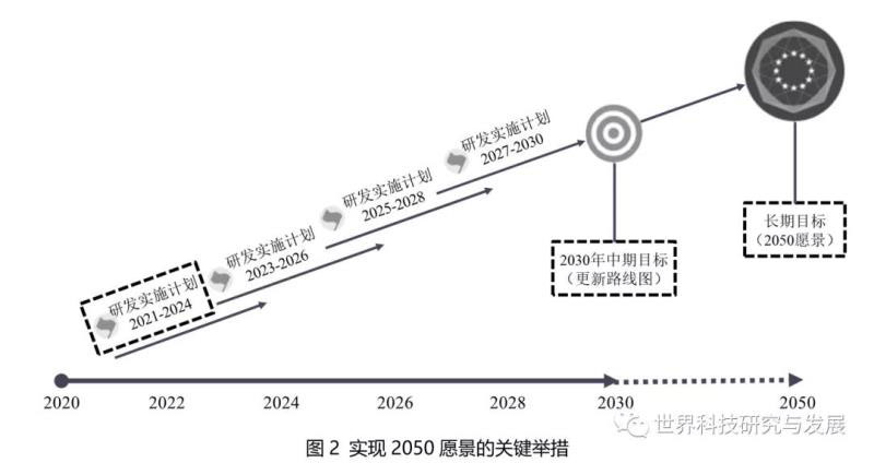 如圖2所示,歐盟計(jì)劃分4個階段實(shí)施2030路線圖,第一階段研發(fā)實(shí)施計(jì)劃于2020年5月發(fā)布,明確了研究創(chuàng)新優(yōu)先事項(xiàng)及相應(yīng)預(yù)算(共約9.55億歐元)。歐盟將陸續(xù)制定后續(xù)實(shí)施計(jì)劃,并在2030年更新研發(fā)路線圖以實(shí)現(xiàn)2050愿景目標(biāo)(圖3)。