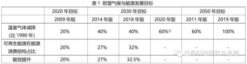 歐盟在能源綠色轉(zhuǎn)型方面的探索一直走在世界前列,將能源政策與氣候政策相整合,2010年起陸續(xù)發(fā)布了《能源2020戰(zhàn)略》、《能源2050路線圖》、《能源與氣候2030戰(zhàn)略》、《歐洲遠(yuǎn)期戰(zhàn)略愿景—給所有人一個清潔星球》和《歐洲綠色協(xié)議》等能源氣候戰(zhàn)略規(guī)劃,構(gòu)建起短、中、長期可持續(xù)的前瞻性能源氣候戰(zhàn)略框架,提出了面向2020、2030和2050年的碳減排、可再生能源占比和能效的具體發(fā)展目標(biāo)(表1)。