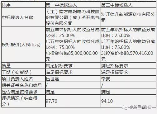 12月22日,廣東粵電靖海發(fā)電#3、#4機(jī)組儲能調(diào)頻項(xiàng)目中標(biāo)公示,南方電網(wǎng)電力科技股份有限公司與燕開電氣股份有限公司聯(lián)合體為第一中標(biāo)候選人,總投資價格8500萬元。第二中標(biāo)候選人為德升新能源,投標(biāo)價格8857萬元。