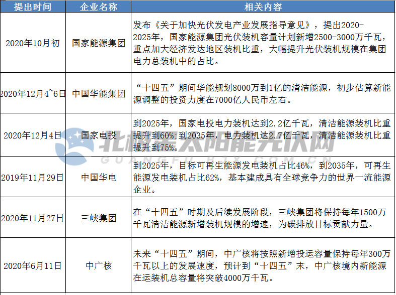 國家主席習(xí)近平12月12日在氣候雄心峰會上宣布到2030年,風(fēng)電、太陽能發(fā)電總裝機容量將達(dá)到12億千瓦以上。國家能源局新能源司副司長任育之不久前也曾預(yù)測,今年年底光伏發(fā)電從規(guī)模上將超過風(fēng)電,成為全國第三大電源,十四五新增光伏裝機規(guī)模需求還將遠(yuǎn)高于十三五?;诖斯夥袠I(yè)、企業(yè)對于“十四五”光伏產(chǎn)業(yè)表現(xiàn)出極大的信心并加緊制定新的企業(yè)發(fā)展規(guī)劃,“五大四小”發(fā)電集團同樣如此。
