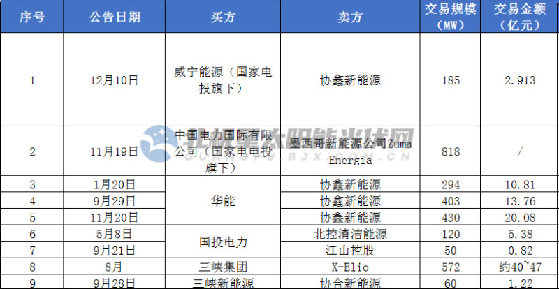 國家電投旗下中國電力國際有限公司、威寧能源兩家子公司共交易光伏電站規(guī)模1.003GW,交易金額2.9億元以上。