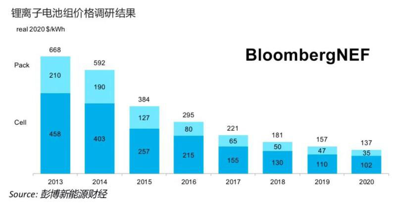 2010年到2020年間,全球鋰離子電池組平均價格從1100美元/千瓦時降至137美元/千瓦時,降幅達(dá)89%。根據(jù)彭博新能源財經(jīng)的最新預(yù)測,到2023年,鋰離子電池組平均價格將接近100美元/千瓦時。